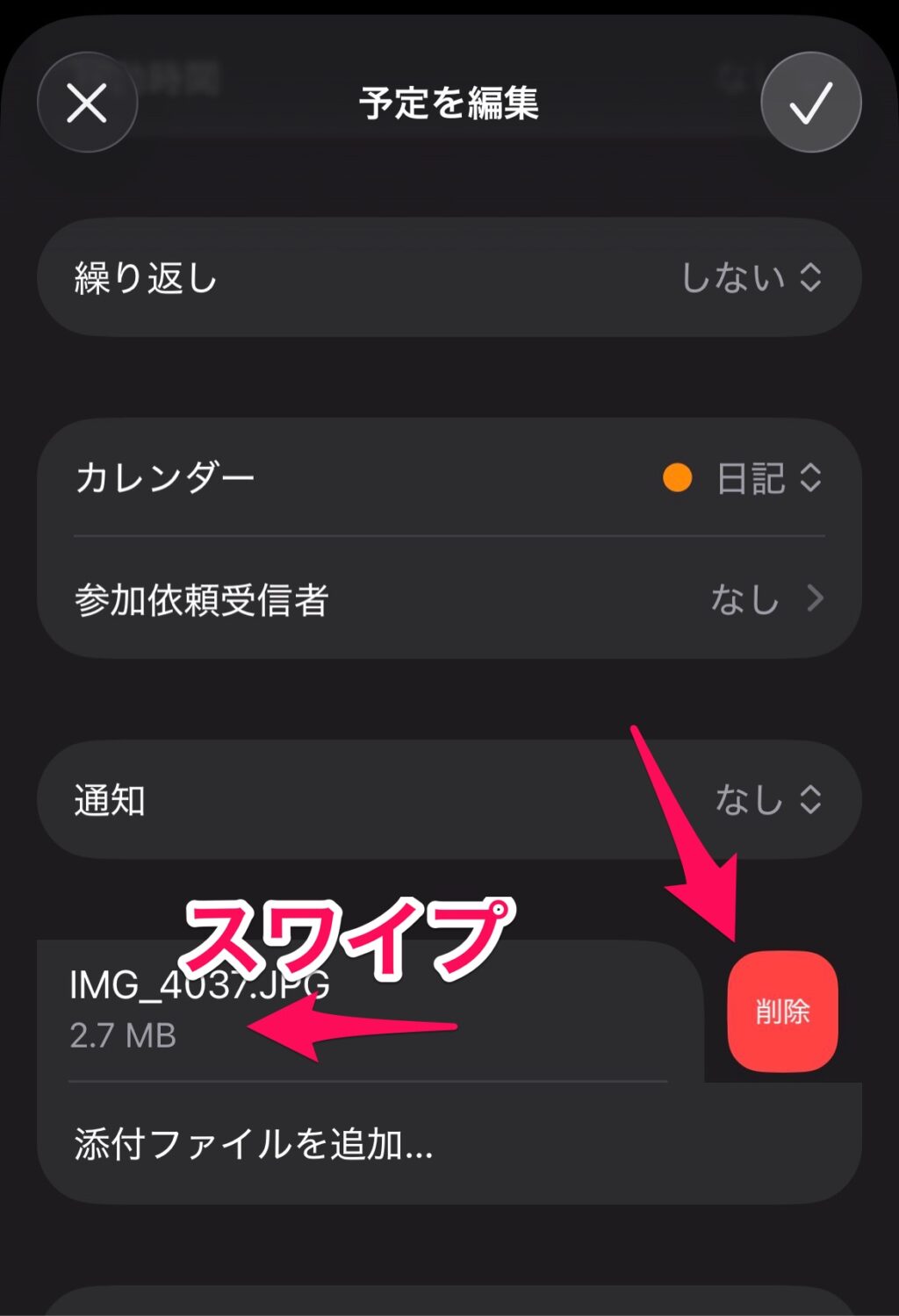 添付した写真を見るときは、予定を開いて予定の下にあるファイルをタップします。