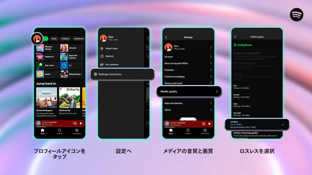 Spotifyでロスレス再生をするには設定が必要です。