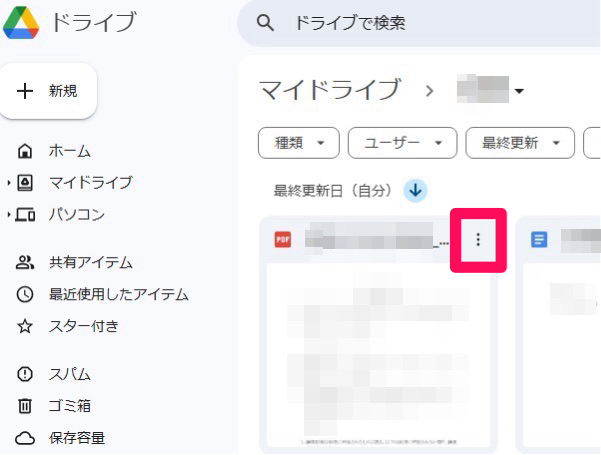 GoogleドライブでPDFファイルの右上の縦の三点リーダー「…」をクリックします。