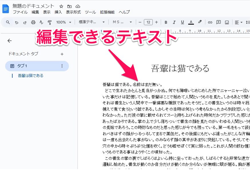 Googleドキュメントで開いたファイルはテキスト形式になっているので、自由に編集できるようになります。