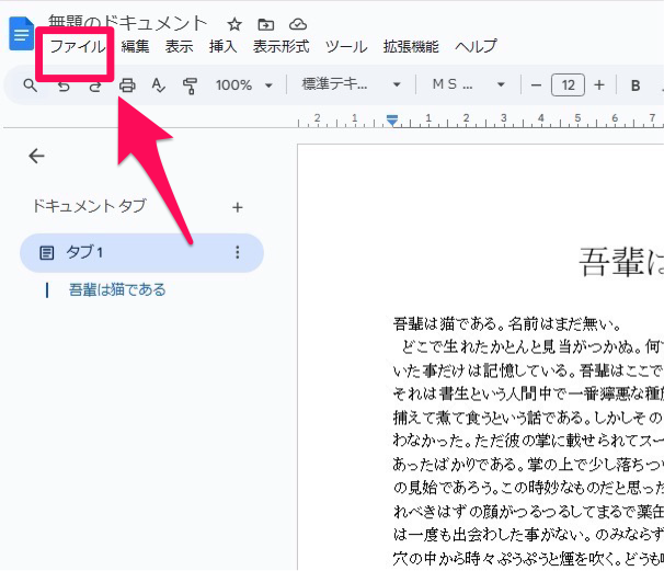 Googleドキュメントで編集が完了したら、左上の「ファイル」をクリックします。