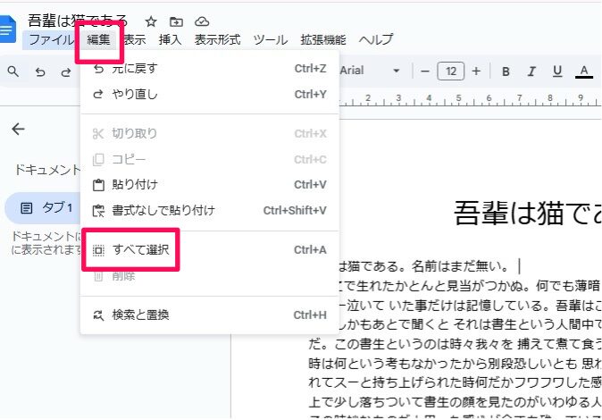 全てのテキストを選択するには、左上の「編集」→「すべて選択」とクリックします。