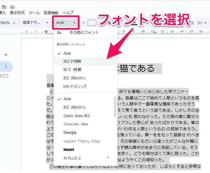 元のフォントと同じフォントがわかれば、Googleドキュメントのフォントを変更すればフォントを変えられます。