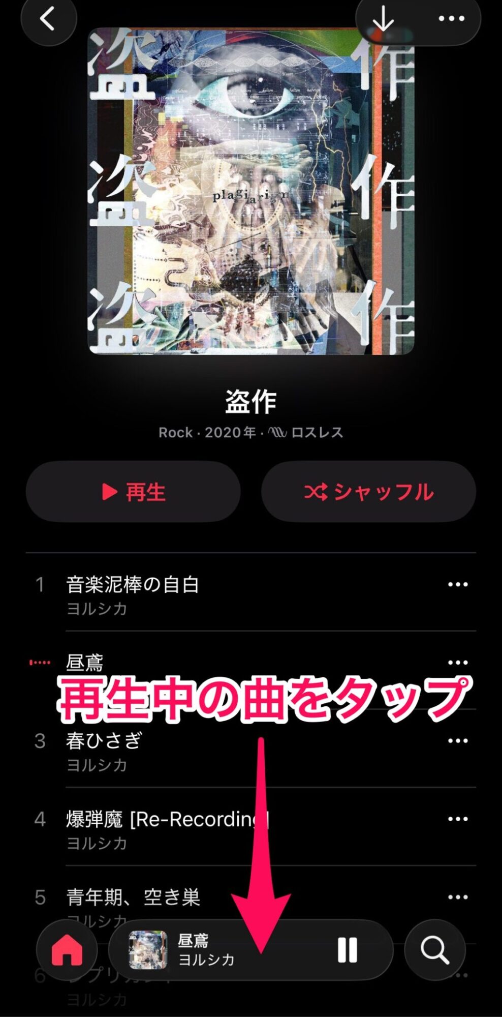 Musicアプリで歌詞を表示させるには、曲を再生して画面の下の再生中の曲名をタップします。