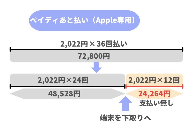 ペイディあと払いプランは、対象機種の下取り後の価格を36回払いにし、24回目に新しいiPhoneに買い替えると残りの12回分の支払いが不要になります。(条件あり)