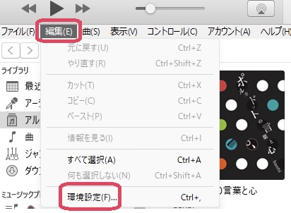 iTunesのメニューの「編集」をクリックし、「環境設定」をクリックします。
