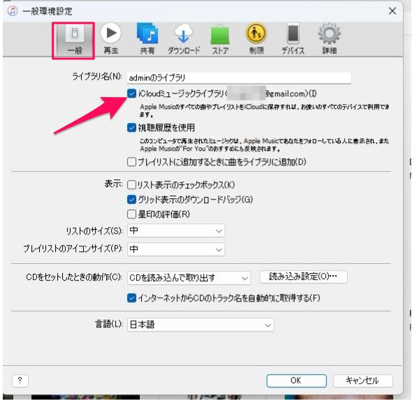 環境設定の中の「一般」タブにある「iCloudミュージックライブラリ」のチェックボックスをクリックしてチェックを入れます。
